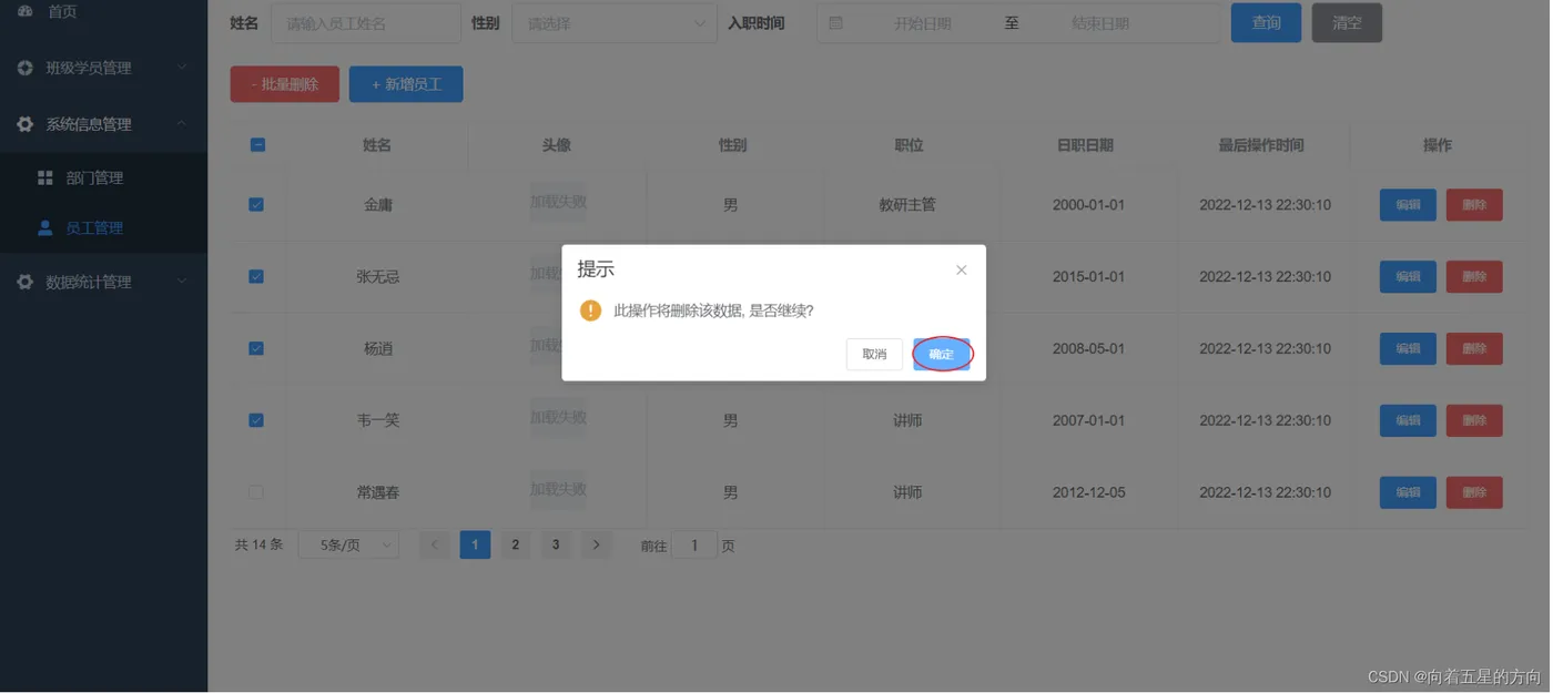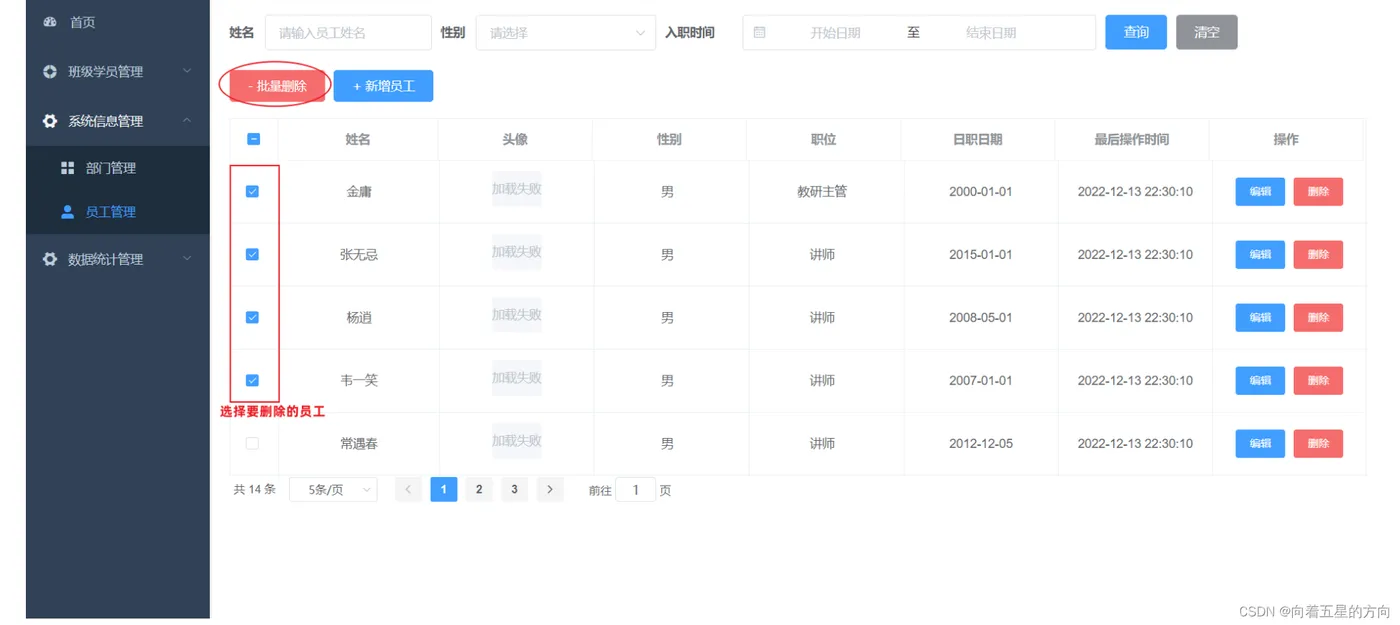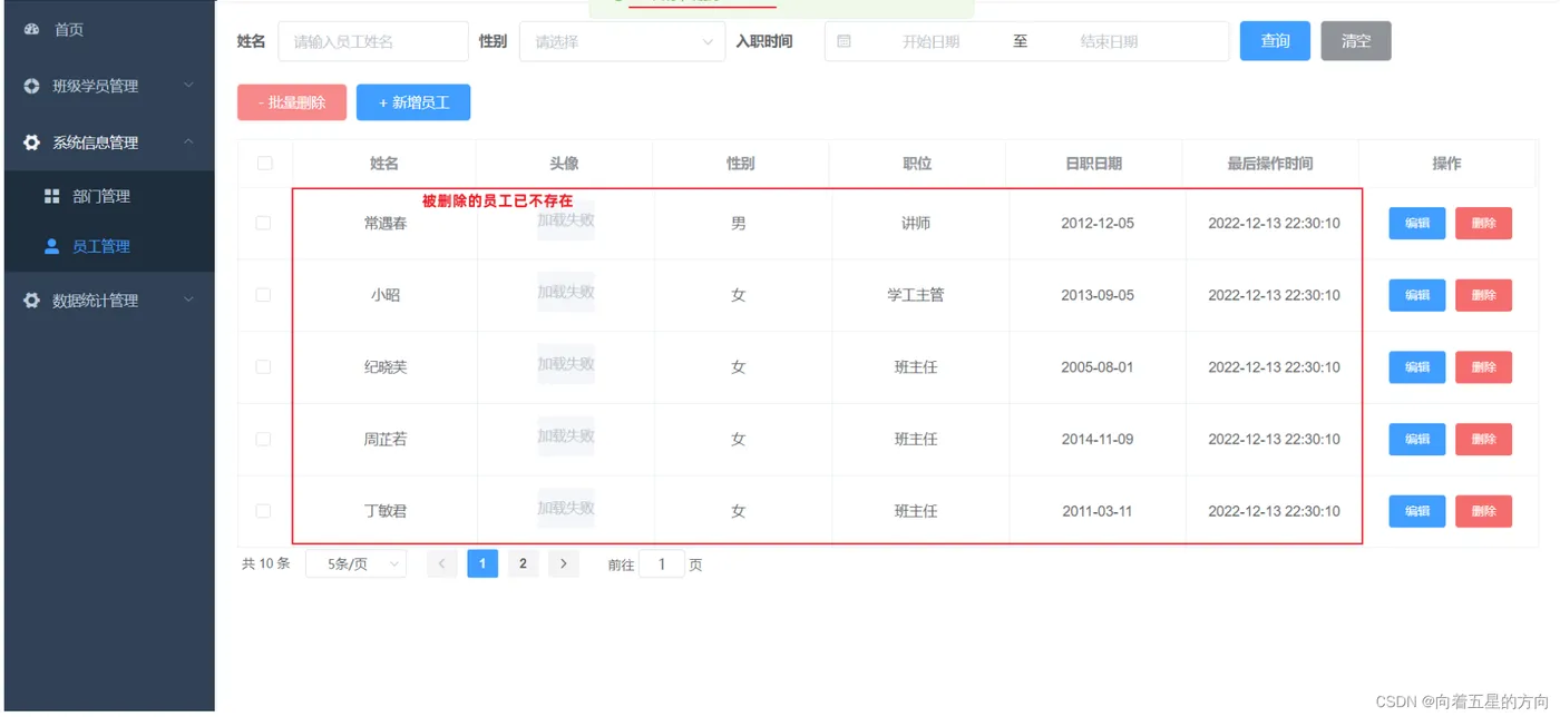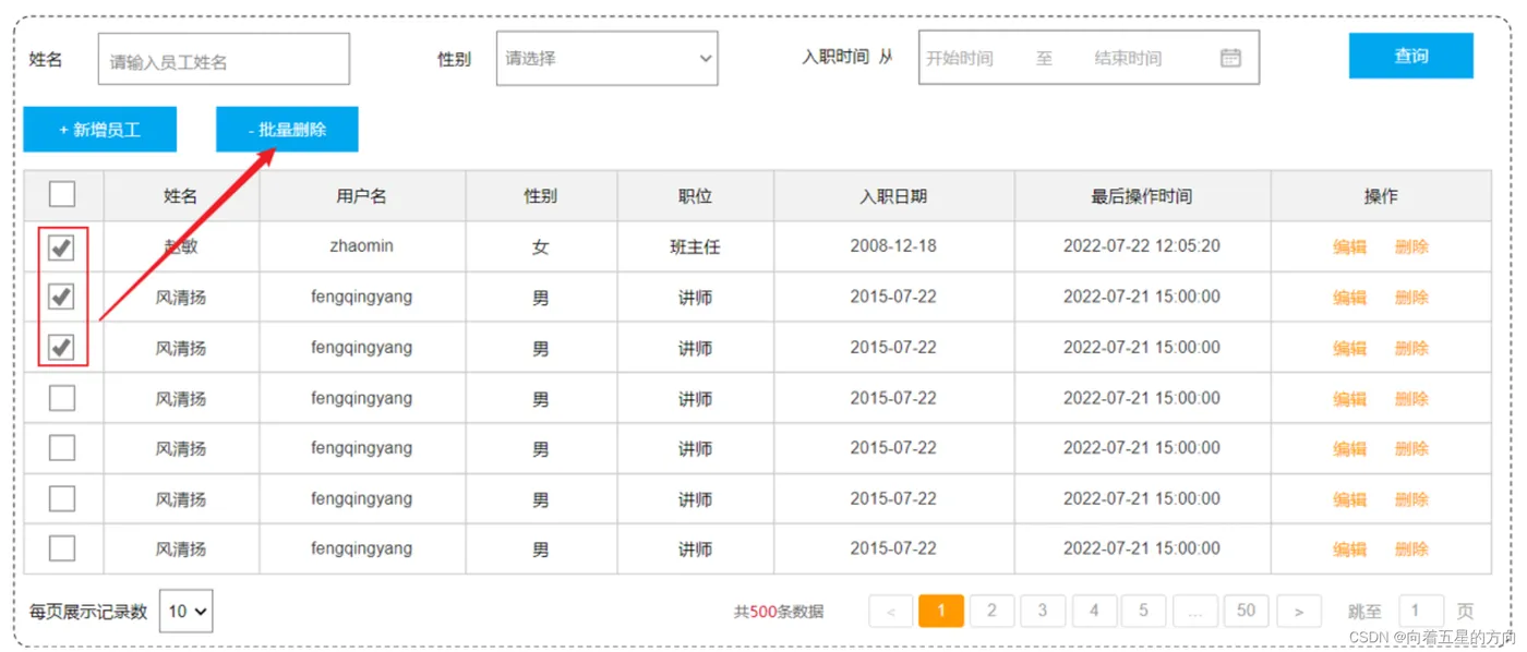 当我们勾选列表前面的复选框,然后点击 "批量删除" 按钮,就可以将这一批次的员工信息删除掉了。也可以只勾选一个复选框,仅删除一个员工信息。