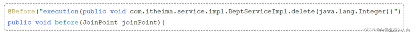 @Before("execution(void com.itheima.service.impl.DeptServiceImpl.delete(java.lang.Integer))")