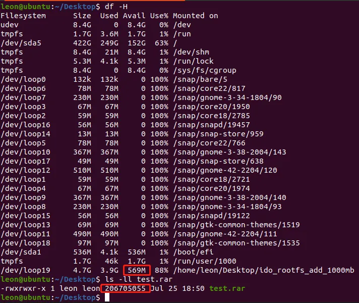 首先你的确认./remake_rootfs.sh.x -m ido_rootfs_add_1000mb.img桌面上的文件夹有内容 , 然后执行df -H可以看到当前PC 系统上挂载了一个分区剩余大小是569M 。