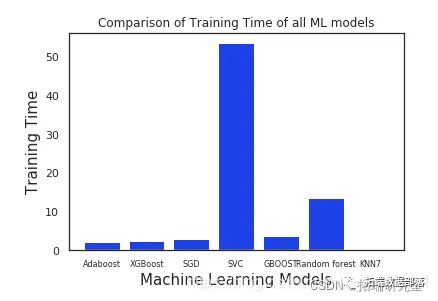 从上图可以明显看出,与其他模型相比,Adaboost和XGboost花费的时间少得多,而其他模型由于SVC花费了最多的时间,原因可能是我们已经将一些关键参数传递给了SVC。