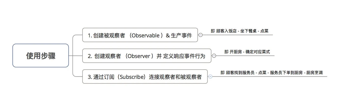 | 订阅(Subscribe) | 连接 被观察者 & 观察者 | 服务员 |