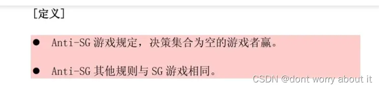 这是一个施加于集合的运算,表示求出这个集合中最小的没有出现过的非负整数,比如 m e x { 0 , 2 , 3 } = 1 , m e x { 1 , 2 } = 0 , m e x { } = 0 mex\{0,2,3\}=1,mex\{1,2\}=0,mex\{\}=0mex{0,2,3}=1,mex{1,2}=0,mex{}=0。
