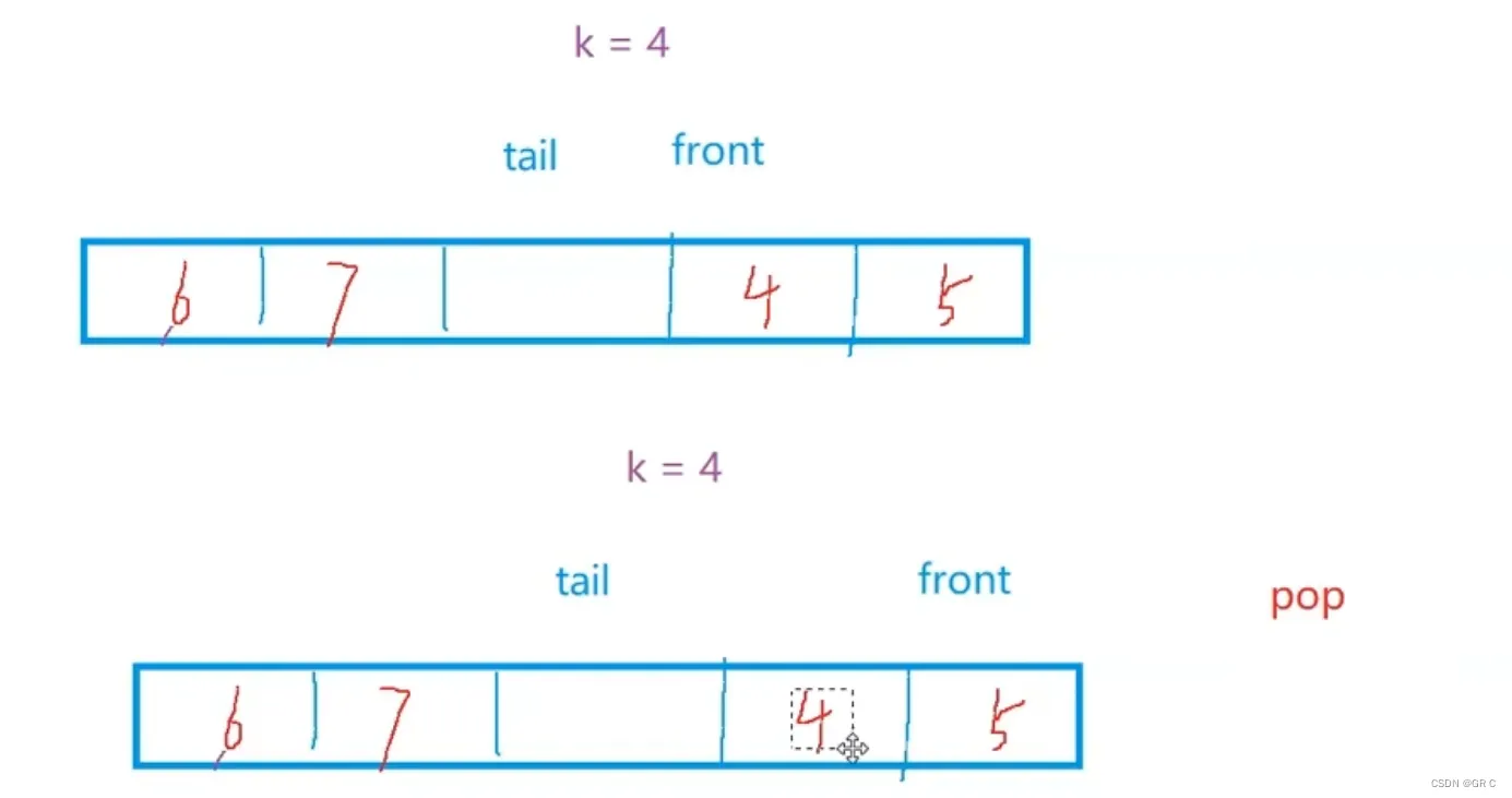 typedef struct { //匿名结构体 int* arr; int front; int tail; int k; } MyCircularQueue; bool myCircularQueueIsEmpty(MyCircularQueue* obj);//可以先实现这两个 声明后下面可以用 bool myCircularQueueIsFull(MyCircularQueue* obj); MyCircularQueue* myCircularQueueCreate(int k) { MyCircularQueue* cq = (MyCircularQueue*)malloc(sizeof(MyCircularQueue)); //OJ题一般都会开辟空间成功,不用判空了 cq->arr = (int*)malloc(sizeof(int) * (k + 1));//初始化 开k+1个空间 cq->front = cq->tail = 0; cq->k = k; return cq; } bool myCircularQueueEnQueue(MyCircularQueue* obj, int value) { //enQueue(value): 向循环队列插入一个元素。如果成功插入则返回真。 //(失败返回假)满了就失败 //先滑到下面实现myCircularQueueIsFull和myCircularQueueIsEmpty,记得在上面声明 if (myCircularQueueIsFull(obj)) { return false; } obj->arr[obj->tail] = value; obj->tail++; obj->tail %= (obj->k + 1);//超出k+1就模到0从头开始,没超,模和没模一样 return true; } bool myCircularQueueDeQueue(MyCircularQueue* obj) { //deQueue(): 从循环队列中删除一个元素。如果成功删除则返回真。 if (myCircularQueueIsEmpty(obj)) { return false; } obj->front++; //不理解可以看上面的图 obj->front %= (obj->k + 1); //超出k+1就模到0从头开始,没超,模和没模一样 return true; } int myCircularQueueFront(MyCircularQueue* obj) { //Front: 从队首获取元素。如果队列为空,返回 -1 。 if (myCircularQueueIsEmpty(obj)) { return -1; } return obj->arr[obj->front]; } int myCircularQueueRear(MyCircularQueue* obj) { //Rear: 获取队尾元素。如果队列为空,返回 -1 。 if (myCircularQueueIsEmpty(obj)) { return -1; } if (obj->tail == 0)//如果tail在0上,返回tail的上一个就是k { return obj->arr[obj->k]; } else { return obj->arr[obj->tail - 1]; } } bool myCircularQueueIsEmpty(MyCircularQueue* obj) { return obj->front == obj->tail; //看上面图的判空和判满条件 } bool myCircularQueueIsFull(MyCircularQueue* obj) { return (obj->tail + 1) % (obj->k + 1) == obj->front; } void myCircularQueueFree(MyCircularQueue* obj) { free(obj->arr); free(obj); //有两层 结构体里面有个数组 }