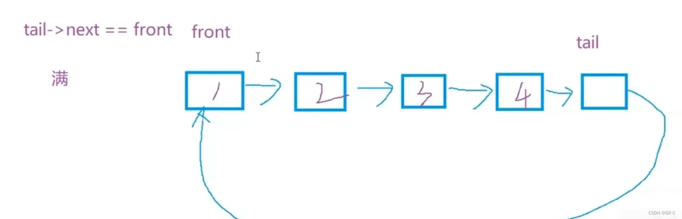 一般情况tail+1等于front 如上面tail 是【1】,front是【2】(1+1)%(4+1)==2也是满