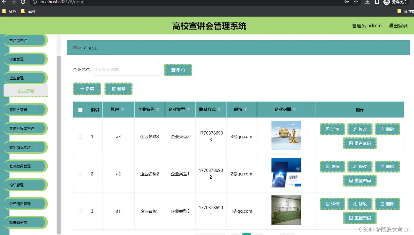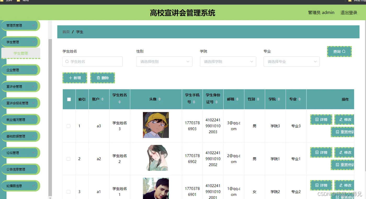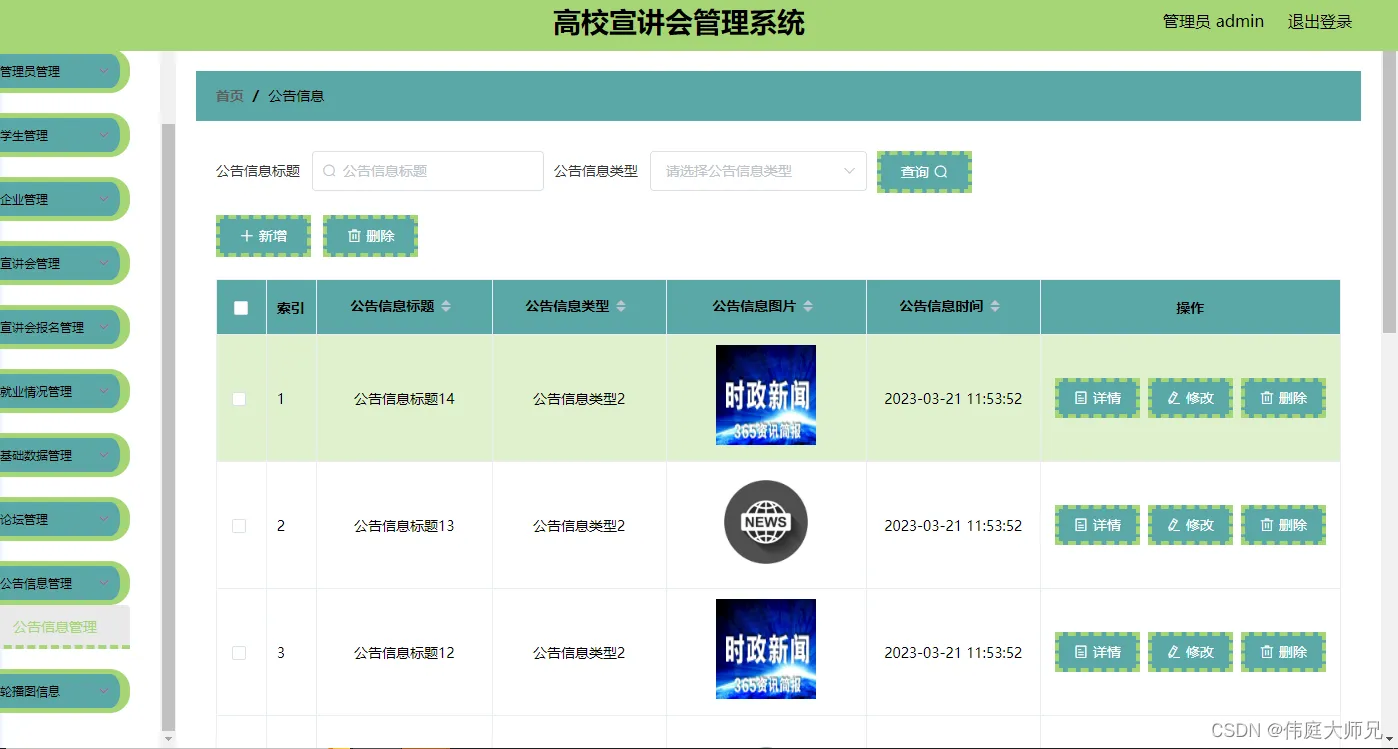 如图5.3显示的就是宣讲会管理页面,此页面提供给管理员的功能有:根据宣讲会进行条件查询,还可以对宣讲会进行新增、修改、查询操作等等。