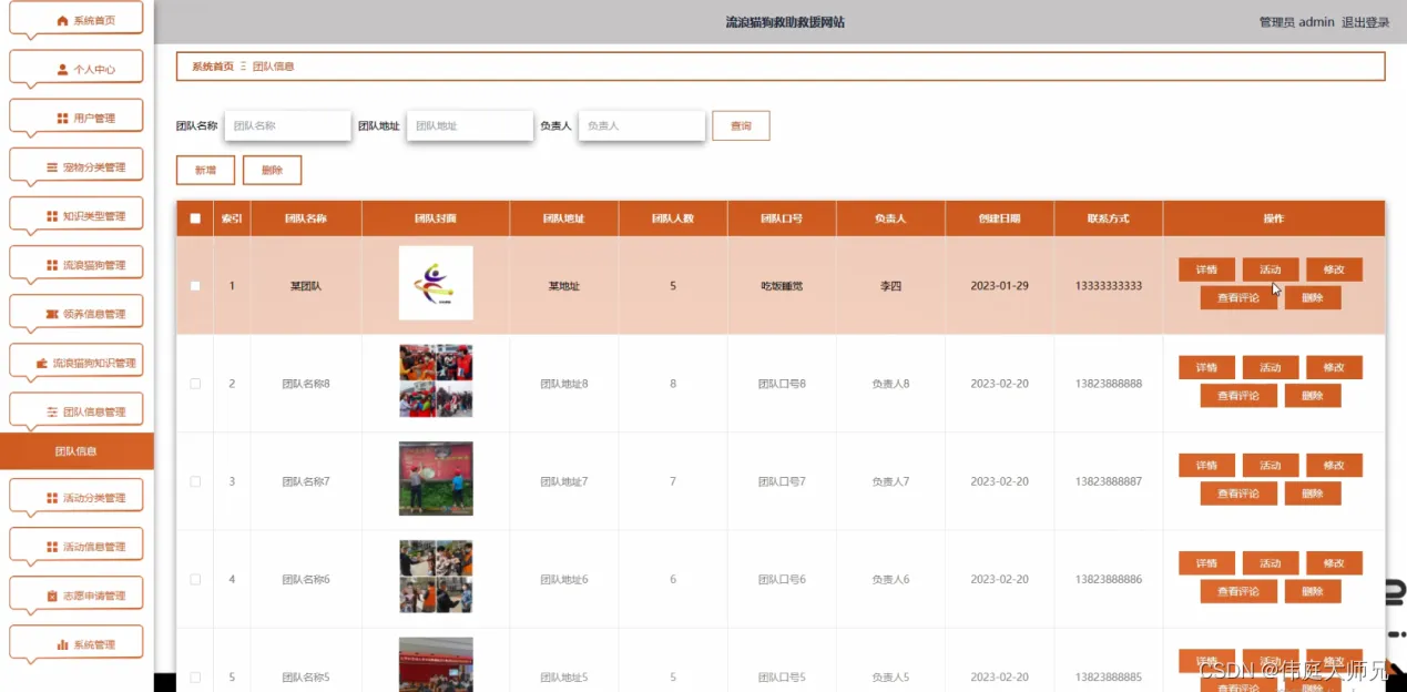 管理员点击团队信息管理。在团队信息页面输入团队名称、团队地址和负责人进行查询、新增或删除团队信息列表,并根据需要对团队详情信息进行详情、活动、修改、查看评论或删除操作;如图5-13所示: