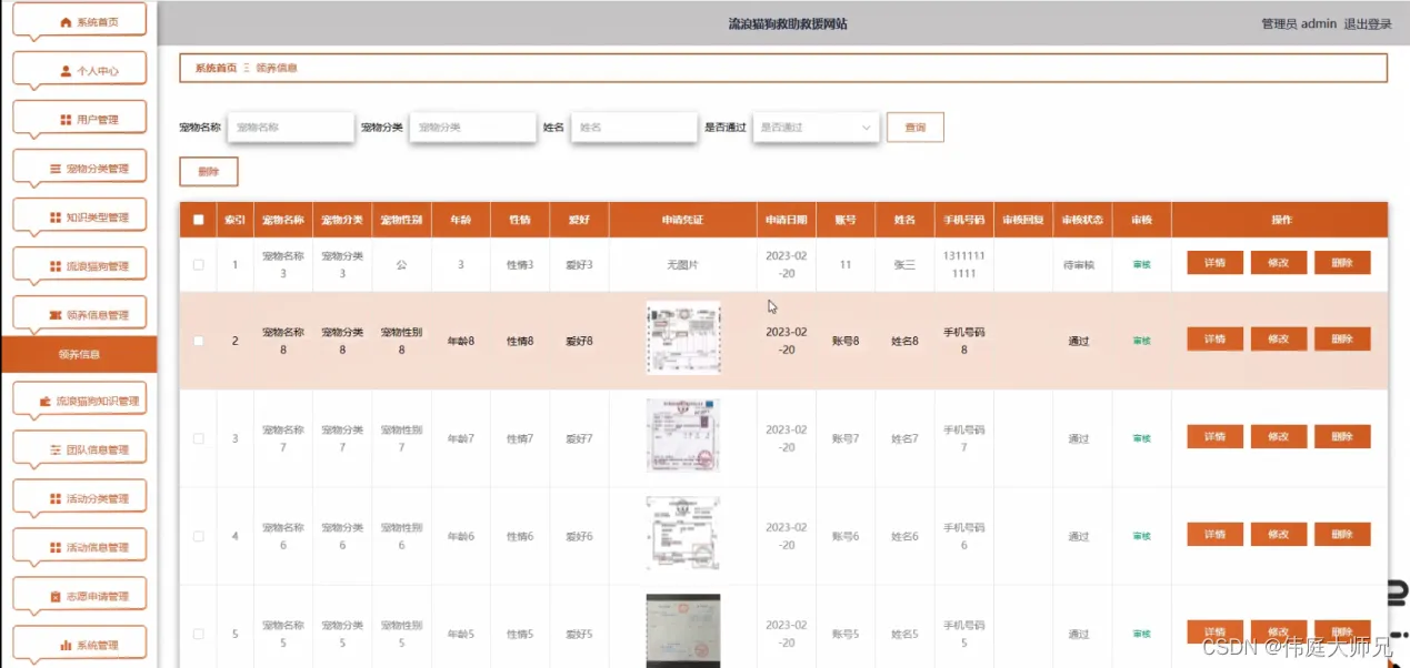 管理员点击领养信息管理。在领养信息页面输入宠物名称、宠物分类、姓名和选择是否通过进行查询或删除领养信息列表,并根据需要对领养详情信息进行详情、修改或删除操作;如图5-11所示: