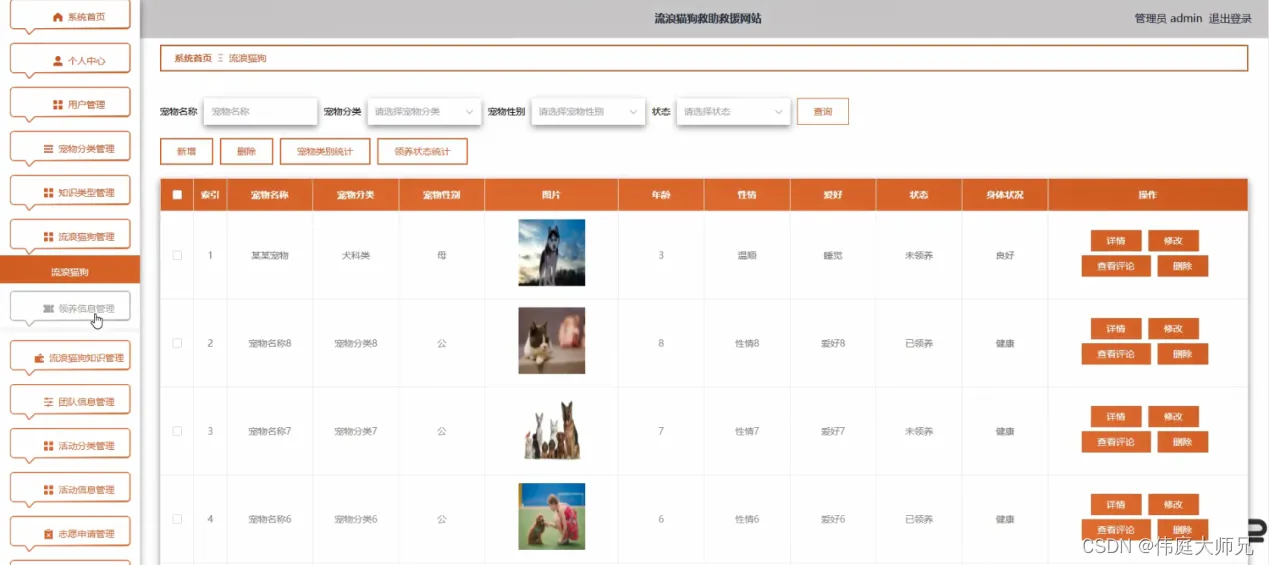 管理员点击流浪猫狗管理。在流浪猫狗页面输入宠物名称、选择宠物分类、宠物性别和状态进行查询、宠物类别统计、领养状态统计、新增或删除流浪猫狗列表,并根据需要对流浪猫狗详情信息进行详情、修改、查看评价或删除操作;如图5-10所示: