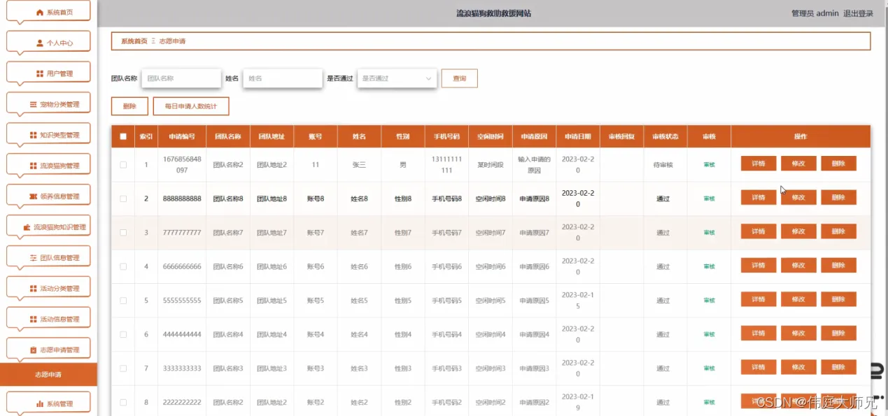 管理员点击志愿申请管理。在志愿申请页面输入团队名称、姓名和选择是否通过进行查询、每日申请人数统计或删除志愿申请列表,并根据需要对志愿申请详情信息进行详情、修改或删除操作;如图5-15所示: