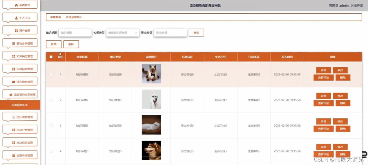 管理员点击流浪猫狗知识管理。在流浪猫狗知识页面输入知识标题、形态特征和选择知识类型进行查询、新增或删除流浪猫狗知识列表,并根据需要对流浪猫狗知识详情信息进行详情、修改、查看评论或删除操作;如图5-12所示: