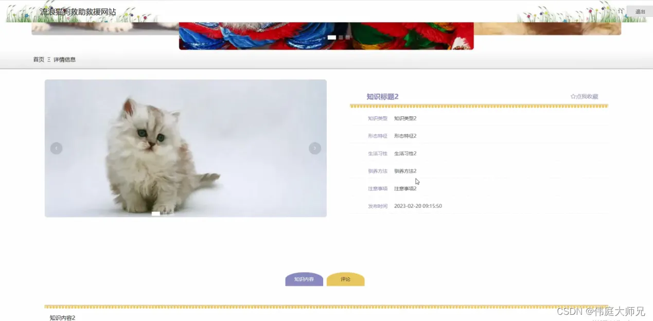 流浪猫狗知识:在流浪猫狗知识页面的输入栏中输入知识标题、形态特征和选择知识类型进行查询,可以查看到流浪猫狗知识详细信息,并根据需要进行评论或收藏操作;流浪猫狗知识页面如图5-3所示: