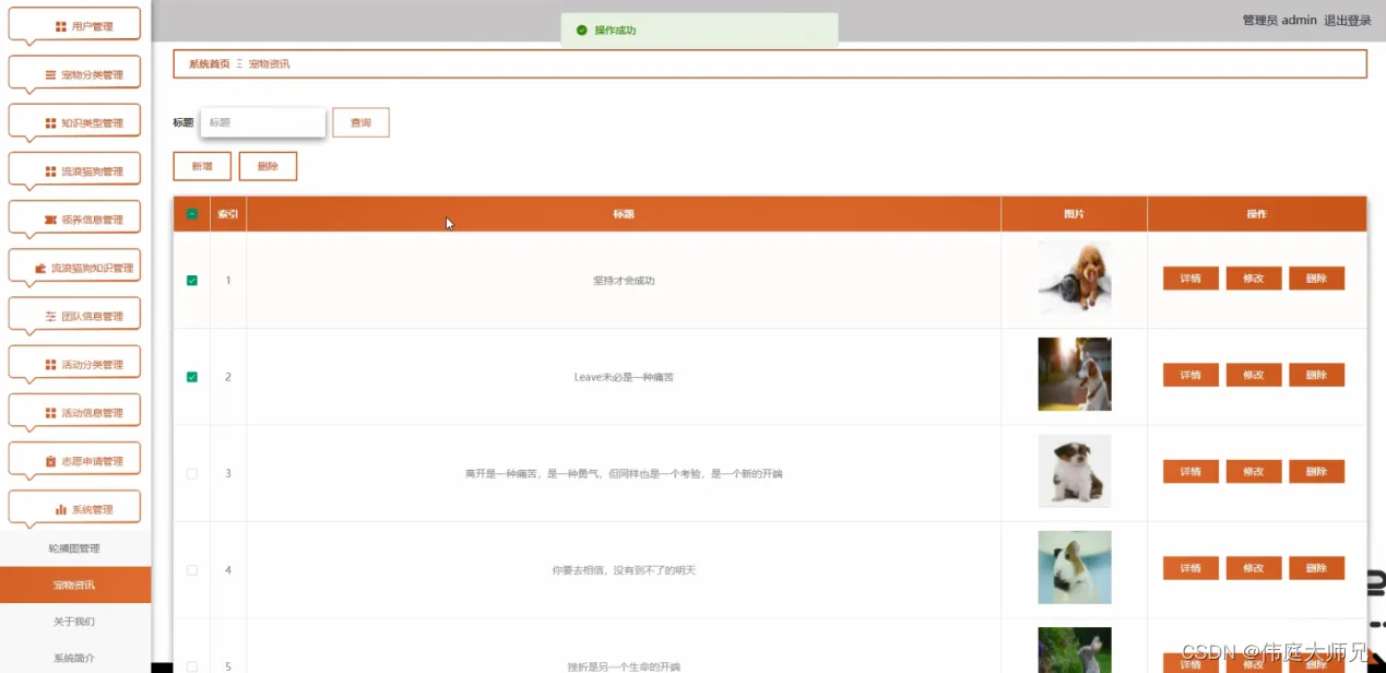 管理员点击系统管理。在宠物资讯页面输入标题进行查询、新增或删除宠物资讯列表,并根据需要对宠物资讯详情信息进行详情、修改或删除操作;还可以对轮播图管理、关于我们和系统简介进行详细操作;如图5-16所示: