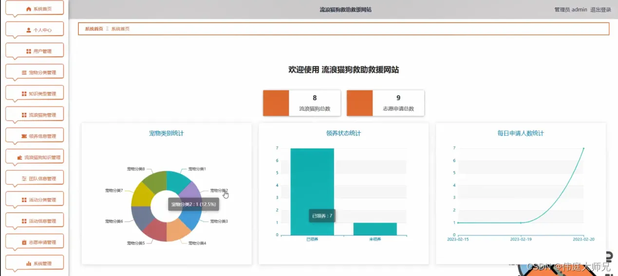 管理员进入主页面,主要功能包括对个人中心、用户管理、宠物分类管理、知识类型管理、流浪猫狗管理、领养信息管理、流浪猫狗知识管理、团队信息管理、活动分类管理、活动信息管理、志愿申请管理、系统管理等进行操作。管理员主页面如图5-8所示: