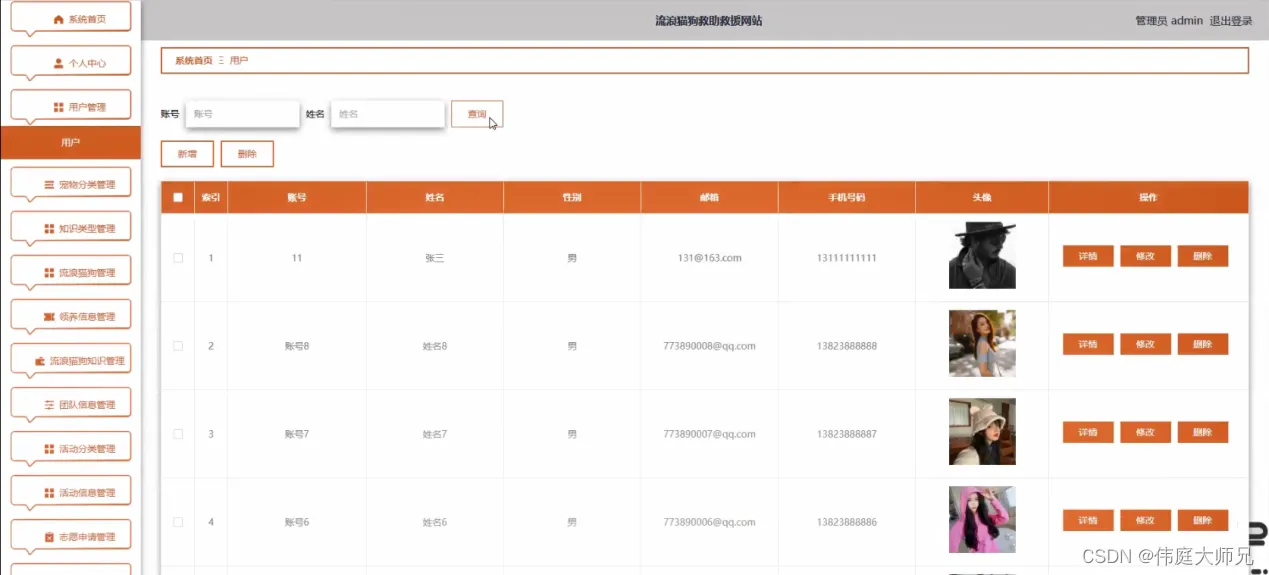 管理员点击用户管理。在用户页面输入账号和姓名进行查询、新增或删除用户列表,并根据需要对用户详情信息进行详情、修改或删除操作;如图5-9所示: