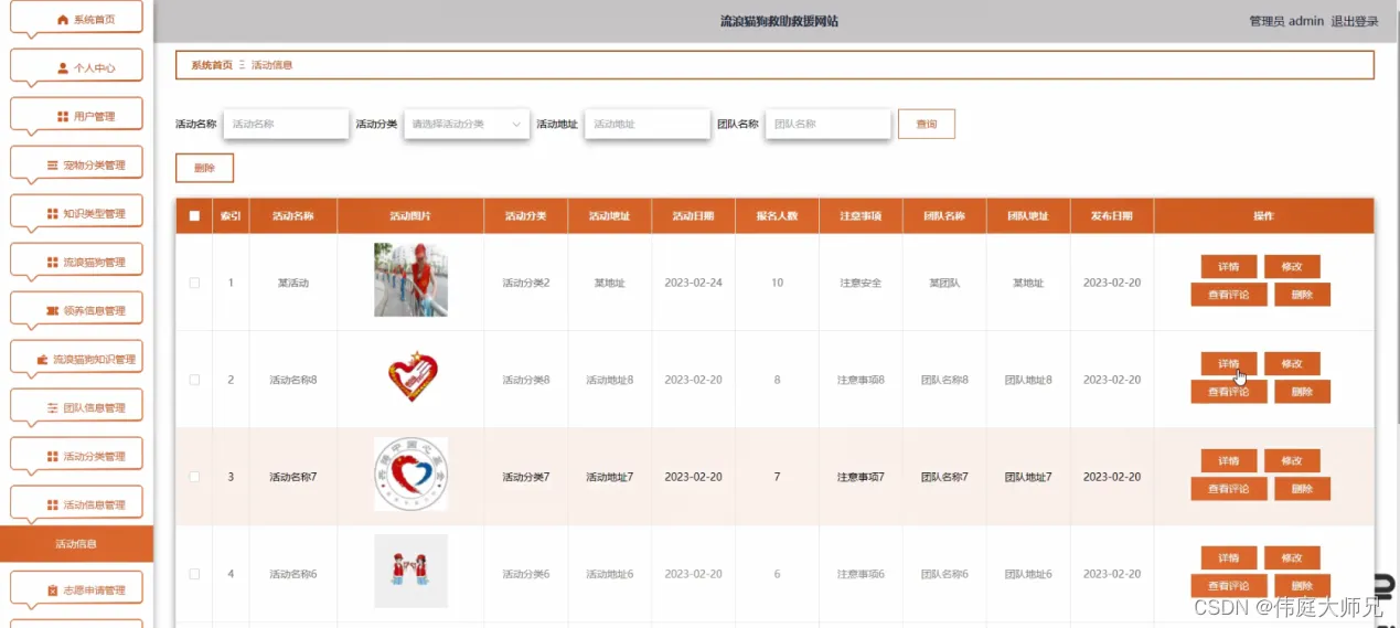 管理员点击活动信息管理。在活动信息页面输入活动名称、活动地址、团队名称和选择活动分类进行查询或删除活动信息列表,并根据需要对活动详情信息进行详情、修改、查看评论或删除操作;如图5-14所示:
