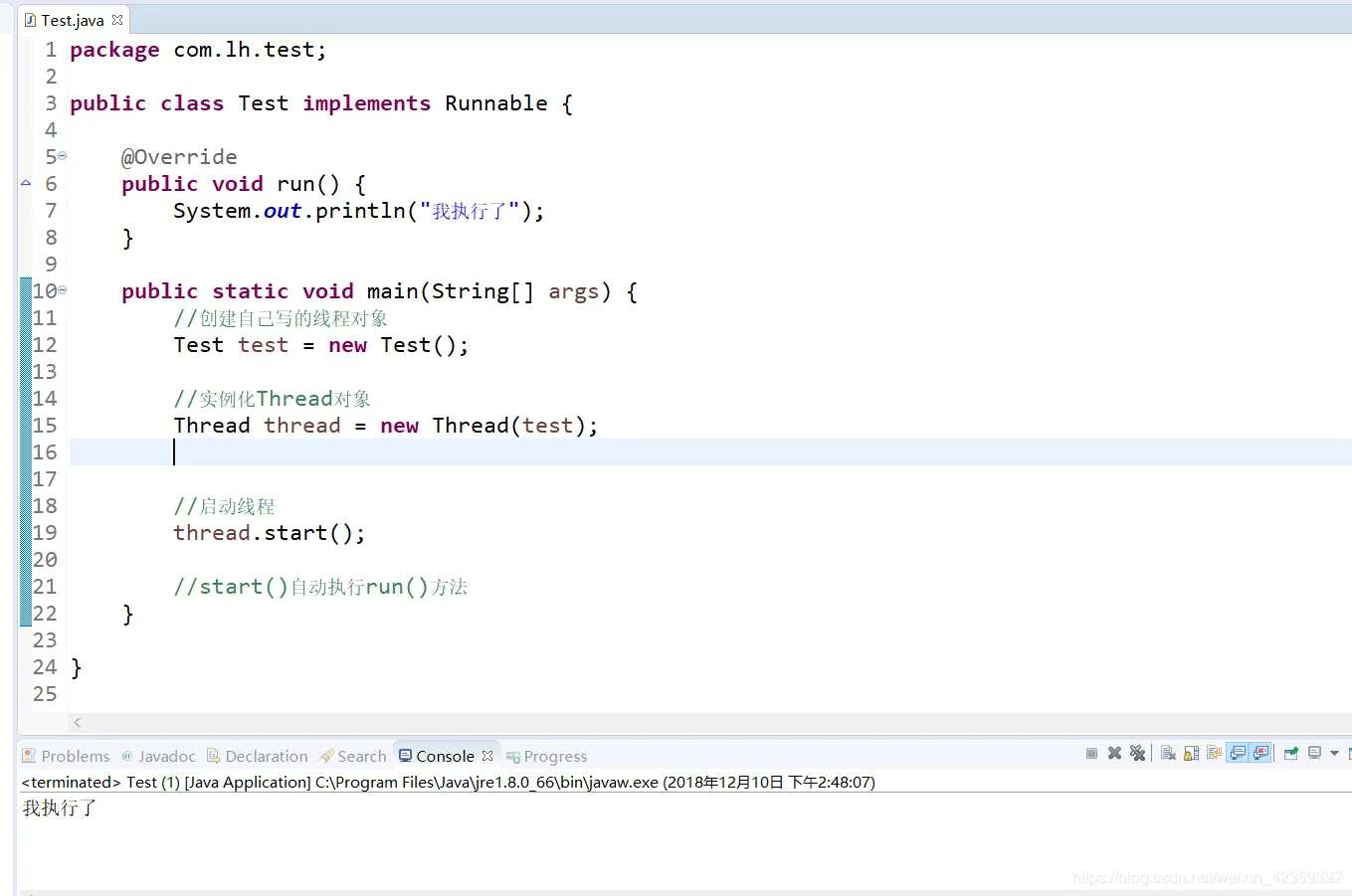 2.使用一个类实现Runnable接口,重写run()方法,使用的时候实例化一个Thread对象,将该类作为参数传入Thread中,并调用start()方法即可启动一个线程,线程会执行run()方法中的内容。来看我自己写的一个小例子: