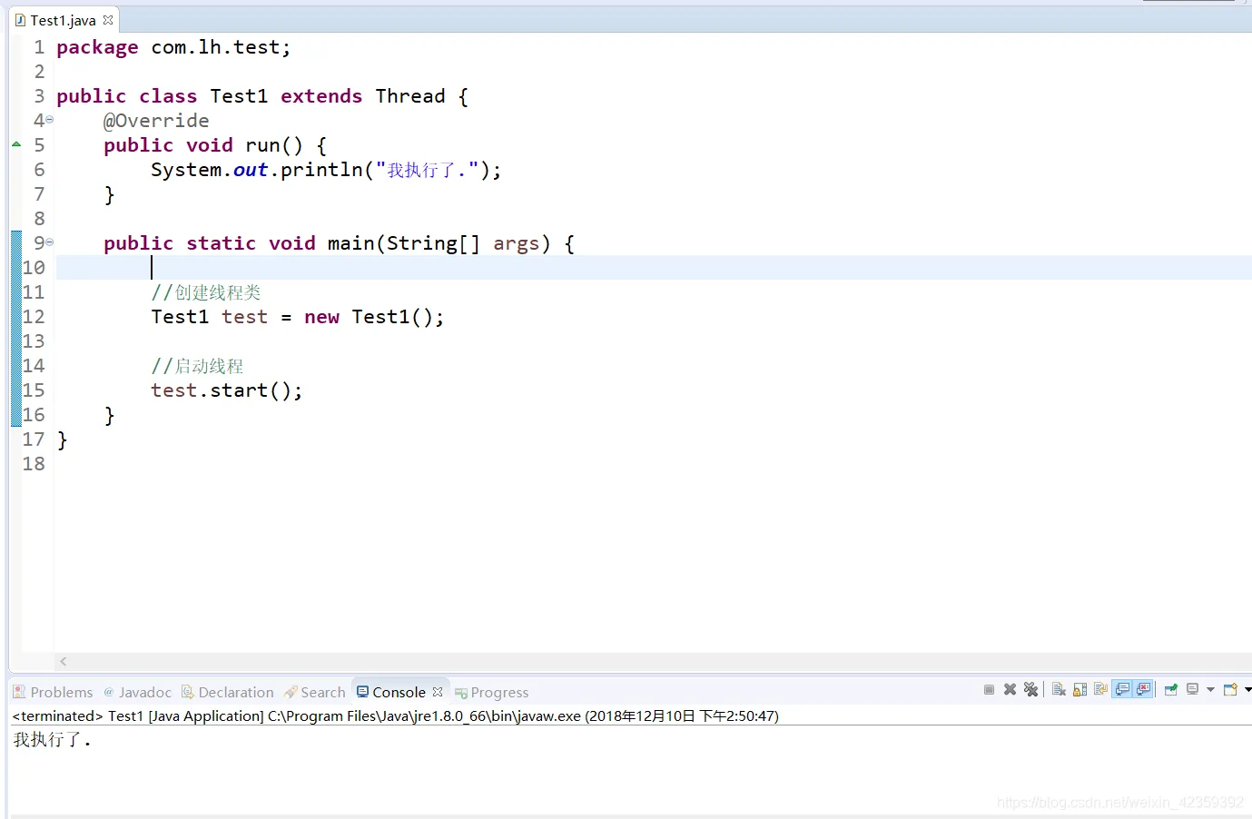 1.使用一个类继承Thread类,并重写run()方法,然后实例化该类,执行start()方法,start()启动线程并执行自己的run()方法,我自己写的一个小例子: