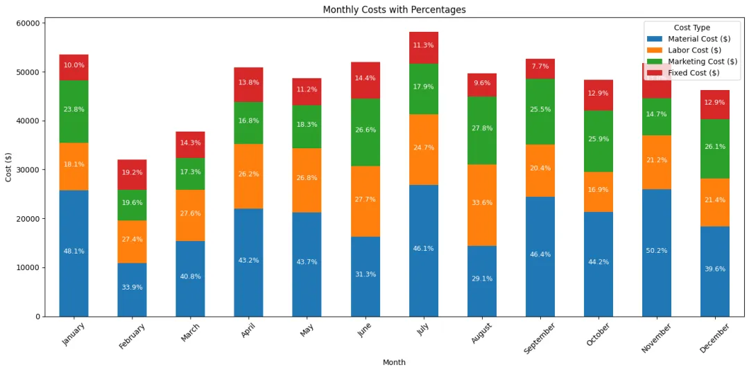 import matplotlib.pyplot as plt import pandas as pd import numpy as np np.random.seed(42) # 确保结果可复现 months = ['January', 'February', 'March', 'April', 'May', 'June', 'July', 'August', 'September', 'October', 'November', 'December'] # 使用提供的数据创建DataFrame cost_data = { 'Month': months, 'Material Cost ($)': np.random.randint(10000, 30000, size=12), 'Labor Cost ($)': np.random.randint(8000, 25000, size=12), 'Marketing Cost ($)': np.random.randint(5000, 15000, size=12), 'Fixed Cost ($)': np.random.randint(4000, 8000, size=12), } cost_df = pd.DataFrame(cost_data) # 计算每个月总成本 cost_df['Total Cost ($)'] = cost_df.drop('Month', axis=1).sum(axis=1) # 计算各成本项占总成本的比例 for column in cost_df.columns[1:-1]: # 排除'Month'和'Total Cost ($)' cost_df[f'{column} Percentage'] = (cost_df[column] / cost_df['Total Cost ($)']) * 100 # 绘制各成本项的柱状图 cost_df.set_index('Month').iloc[:, :4].plot(kind='bar', stacked=True, figsize=(14, 7)) plt.title('Monthly Costs with Percentages') plt.ylabel('Cost ($)') # 添加占比标签 for i, month in enumerate(cost_df['Month']): total_cost = cost_df.loc[i, 'Total Cost ($)'] cumulative_height = 0 for column in cost_df.columns[1:5]: # 选择四个成本列 cost = cost_df.loc[i, column] percentage = (cost / total_cost) * 100 label_y_position = cumulative_height + cost / 2 # 计算标签的y位置 plt.text(i, label_y_position, f'{percentage:.1f}%', ha='center', color='white', fontsize=9) cumulative_height += cost plt.xticks(rotation=45) plt.legend(title='Cost Type') plt.tight_layout() plt.show()
