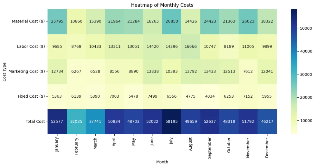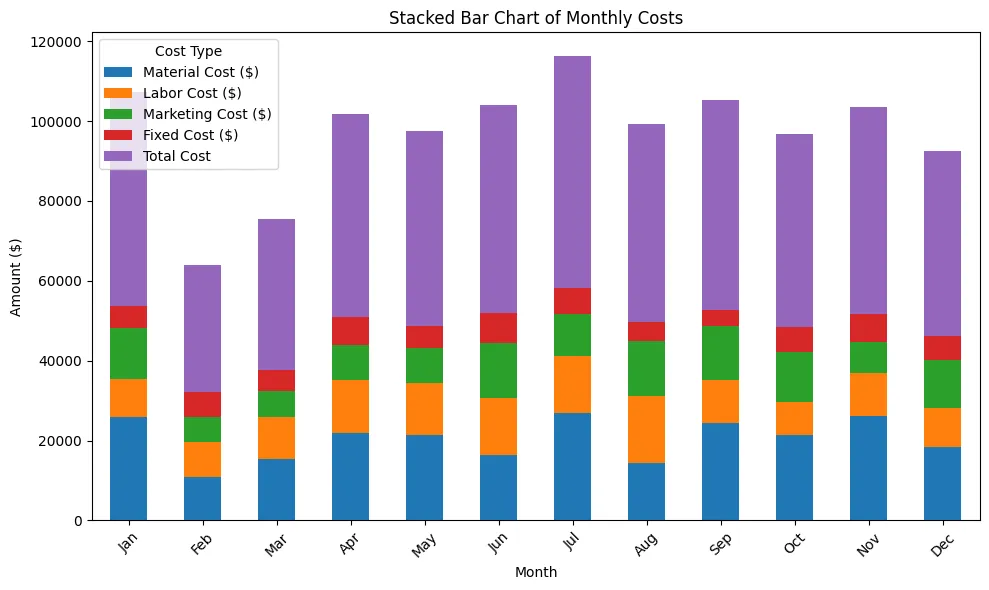import pandas as pd import numpy as np import matplotlib.pyplot as plt import seaborn as sns np.random.seed(42) # Creating DataFrame from provided data cost_data = { 'Month': months, 'Material Cost ($)': np.random.randint(10000, 30000, size=12), 'Labor Cost ($)': np.random.randint(8000, 25000, size=12), 'Marketing Cost ($)': np.random.randint(5000, 15000, size=12), 'Fixed Cost ($)': np.random.randint(4000, 8000, size=12), } cost_df = pd.DataFrame(cost_data) cost_df['Total Cost'] = cost_df['Material Cost ($)']+cost_df['Labor Cost ($)']+cost_df['Marketing Cost ($)']+cost_df['Fixed Cost ($)'] plt.figure(figsize=(12, 6)) plt.plot(cost_df.index, cost_df['Total Cost'], marker='o') plt.title('Monthly Total Cost - Unclear Visualization') plt.ylabel('Cost ($)') plt.xlabel('Month') plt.xticks() plt.tight_layout() plt.show() # Set 'Month' as index cost_df.set_index('Month', inplace=True) # 1. Stacked Bar Chart for Monthly Costs cost_df.plot(kind='bar', stacked=True, figsize=(10, 6)) plt.title('Stacked Bar Chart of Monthly Costs') plt.ylabel('Amount ($)') plt.xticks(rotation=45) plt.legend(title='Cost Type') plt.tight_layout() plt.show() # 2. Trend Line Chart for Each Cost Type plt.figure(figsize=(12, 6)) for column in cost_df.columns: plt.plot(cost_df.index, cost_df[column], marker='o', label=column) plt.title('Trend Lines for Each Cost Type') plt.xticks(rotation=45) plt.ylabel('Amount ($)') plt.legend() plt.tight_layout() plt.show() # 3. Heatmap for Monthly Costs # Creating a new DataFrame suitable for heatmap heatmap_data = cost_df.T # Transpose to get cost types as rows and months as columns plt.figure(figsize=(12, 6)) sns.heatmap(heatmap_data, cmap="YlGnBu", annot=True, fmt="d") plt.title('Heatmap of Monthly Costs') plt.xlabel('Month') plt.ylabel('Cost Type') plt.tight_layout() plt.show()