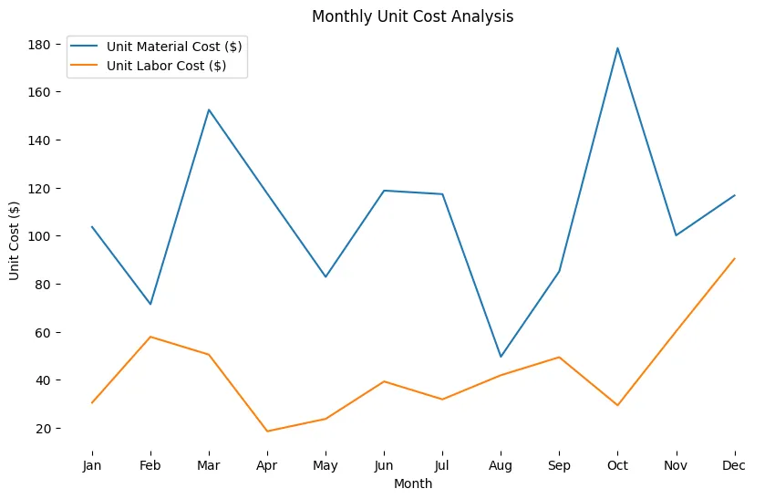 import matplotlib.pyplot as plt import pandas as pd import numpy as np # 设置随机数种子以确保数据的一致性 np.random.seed(42) # 创建模拟的月份和成本数据 months = ['Jan', 'Feb', 'Mar', 'Apr', 'May', 'Jun', 'Jul', 'Aug', 'Sep', 'Oct', 'Nov', 'Dec'] data = { 'Month': months, 'Material Cost ($)': np.random.randint(10000, 30000, size=12), 'Material Quantity': np.random.randint(100, 300, size=12), 'Labor Cost ($)': np.random.randint(8000, 25000, size=12), 'Labor Hours': np.random.randint(200, 500, size=12), } cost_df = pd.DataFrame(data) cost_df['Unit Material Cost ($)'] = cost_df['Material Cost ($)'] / cost_df['Material Quantity'] cost_df['Unit Labor Cost ($)'] = cost_df['Labor Cost ($)'] / cost_df['Labor Hours'] # 绘制没有网格线和边框的折线图 plt.figure(figsize=(10, 6)) plt.plot(cost_df['Month'], cost_df['Unit Material Cost ($)'], label='Unit Material Cost ($)') plt.plot(cost_df['Month'], cost_df['Unit Labor Cost ($)'], label='Unit Labor Cost ($)') plt.title('Monthly Unit Cost Analysis') plt.xlabel('Month') plt.ylabel('Unit Cost ($)') plt.legend() # 移除边框 plt.gca().spines['top'].set_visible(False) plt.gca().spines['right'].set_visible(False) plt.gca().spines['bottom'].set_visible(False) plt.gca().spines['left'].set_visible(False) # 移除网格线 plt.grid(False) plt.show()