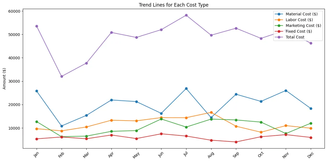 分析方法: 初始分析仅涉及计算每个月的总成本和成本构成,并通过简单的趋势图展示。