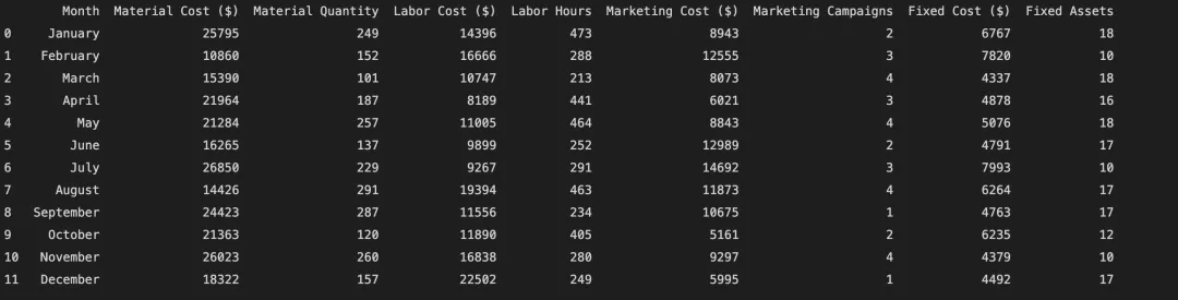 import pandas as pd import numpy as np # 设置随机数种子以确保数据的一致性 np.random.seed(42) # 创建模拟的月份数据 months = ['January', 'February', 'March', 'April', 'May', 'June', 'July', 'August', 'September', 'October', 'November', 'December'] # 创建不同成本类型的模拟数据,包括总成本和用量 data = { 'Month': months, 'Material Cost ($)': np.random.randint(10000, 30000, size=12), 'Material Quantity': np.random.randint(100, 300, size=12), 'Labor Cost ($)': np.random.randint(8000, 25000, size=12), 'Labor Hours': np.random.randint(200, 500, size=12), 'Marketing Cost ($)': np.random.randint(5000, 15000, size=12), 'Marketing Campaigns': np.random.randint(1, 5, size=12), 'Fixed Cost ($)': np.random.randint(4000, 8000, size=12), 'Fixed Assets': np.random.randint(10, 20, size=12) } # 转换为DataFrame cost_df = pd.DataFrame(data) pd.set_option('expand_frame_repr', False) print(cost_df)