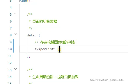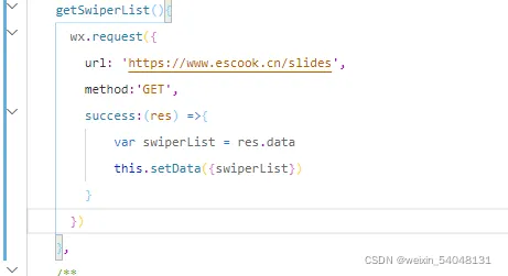 Page({ /** * 页面的初始数据 */ data: { }, getSwiperList(){ wx.request({ url: 'https://www.escook.cn/slides', method: 'GET', success: (res) => { this.setData({ swiperList: res.data }) } }) } ,