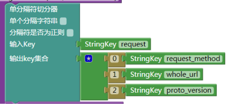 第四步,解析URL。使用“单分隔符切分器”,将request字段按照空格切分,分别获取调用方式(GET/POST)、完整URL、协议版本。