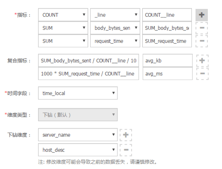 配置数据集,例如要监控接口的访问次数,使用count(_line);要监控平均包体大小,使用sum(包体大小)÷count(_line);要监控平均响应时长,使用sum(响应时长)÷count(_line)。维度根据需要配置,此处配置为先服务器,后接口域名。