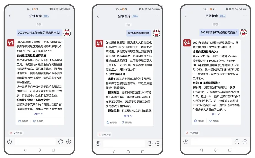 “招银智库AI小研”自上线以来,已累计服务招行数万名用户,为内部零售、对公、风险等条线提供研判支持,帮助一线业务人员实现“研判轻松查、热点实时追、政策深解读、数据好洞察”的工作新方式,大大提升了访前调研、策略制定、报告撰写等工作的效率。同时,在专业研究框架的支持下,“招银智库AI小研”拓宽了问题分析的广度,提升了对专业领域理解的深度,真正切中“AI+金融”的脉搏,将AI研判能力赋能到一线,实现“研究产生价值,研判赋能业务”目标,为招行业务增长贡献研究力量。