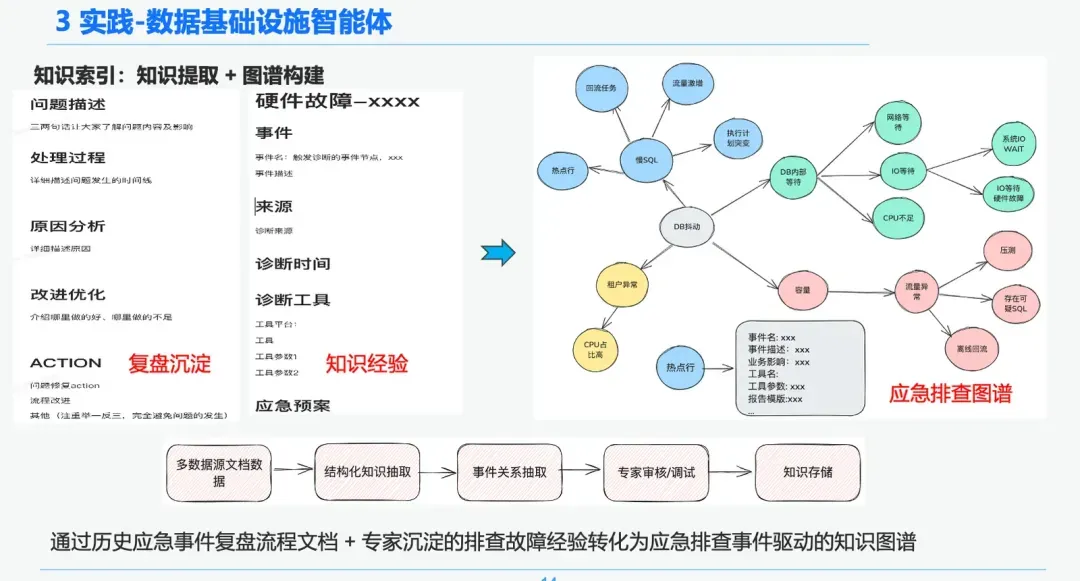 - 数据基础设施智能体:RAG流程是严谨和专业的,需要专属的RAG工作流程,上下文包括(DB告警->根因定位->应急止血->故障恢复),并且需要对专家沉淀的问答和应急经验,进行结构化的抽取,建立层次关系。因此我们选择知识图谱来作为数据承载。