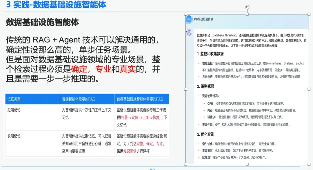 传统的 RAG + Agent 技术可以解决通用的,确定性没那么高的,单步任务场景。但是面对数据基础设施领域的专业场景,整个检索过程必须是确定,专业和真实的,并且是需要一步一步推理的。