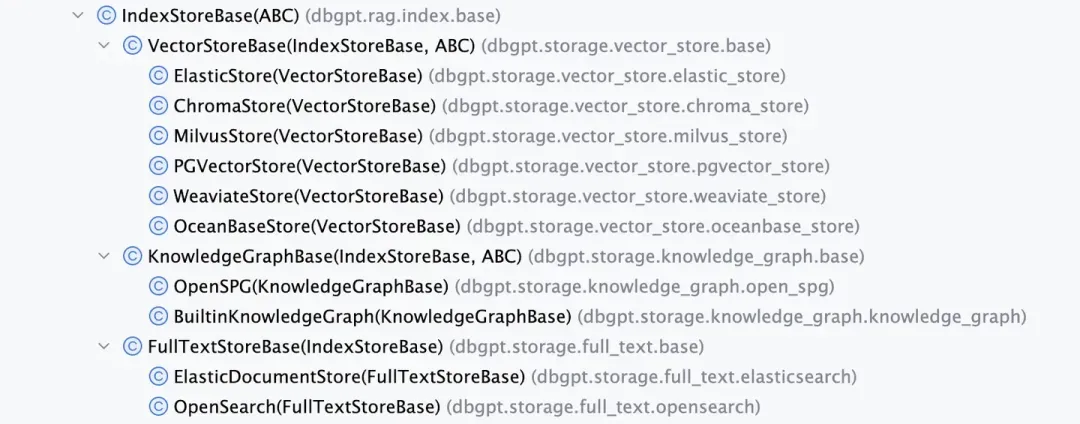 整个知识持久化统一实现了IndexStoreBase接口,目前提供了向量数据库、图数据库、全文索引三类实现。