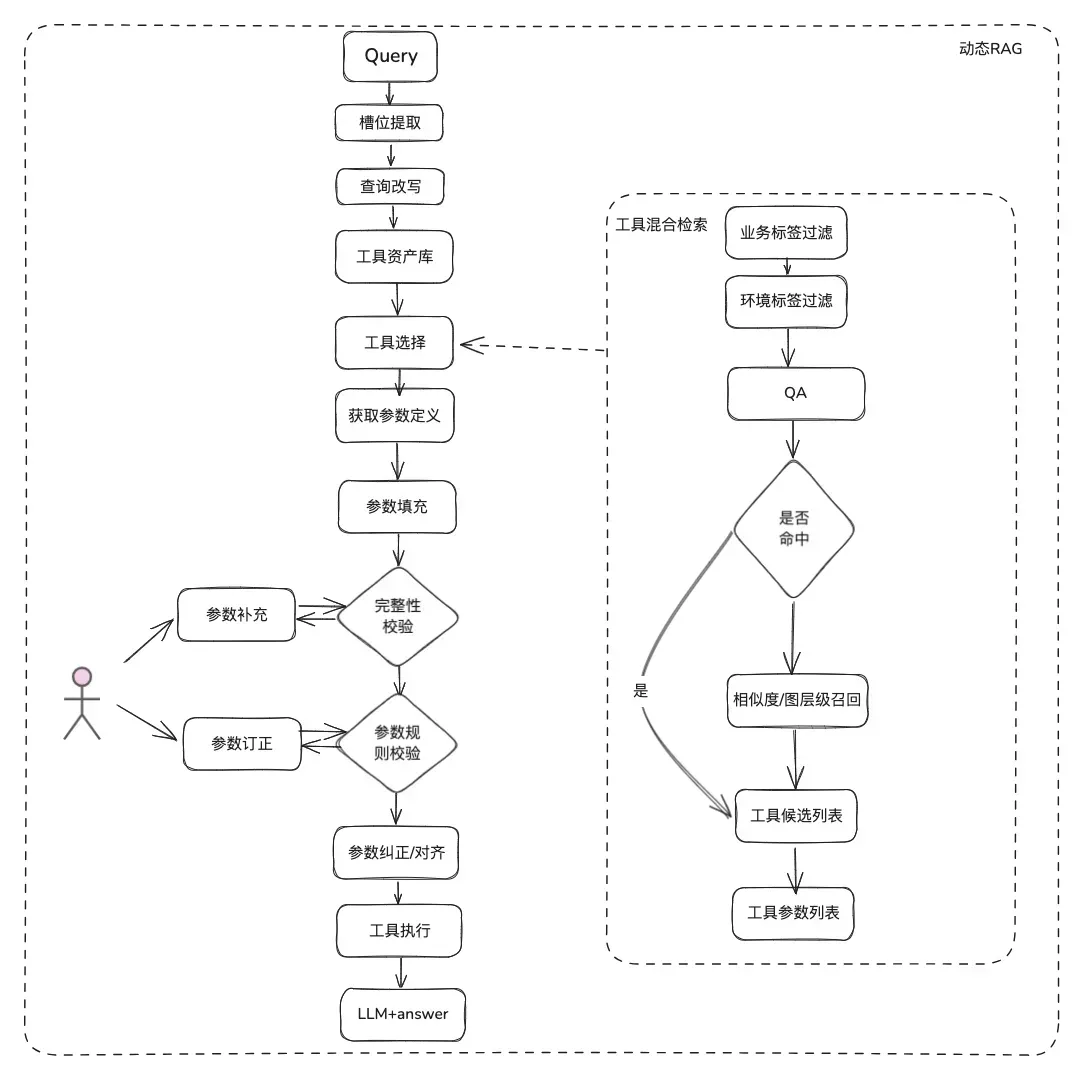 文档类知识是相对静态的,无法回答个性化以及动态的信息, 需要依赖一些第三方平台工具才可以回答,基于这种情况,我们需要一些动态RAG的方法,通过工具资产定义 -> 工具选择 -> 工具校验 -> 工具执行获取动态数据