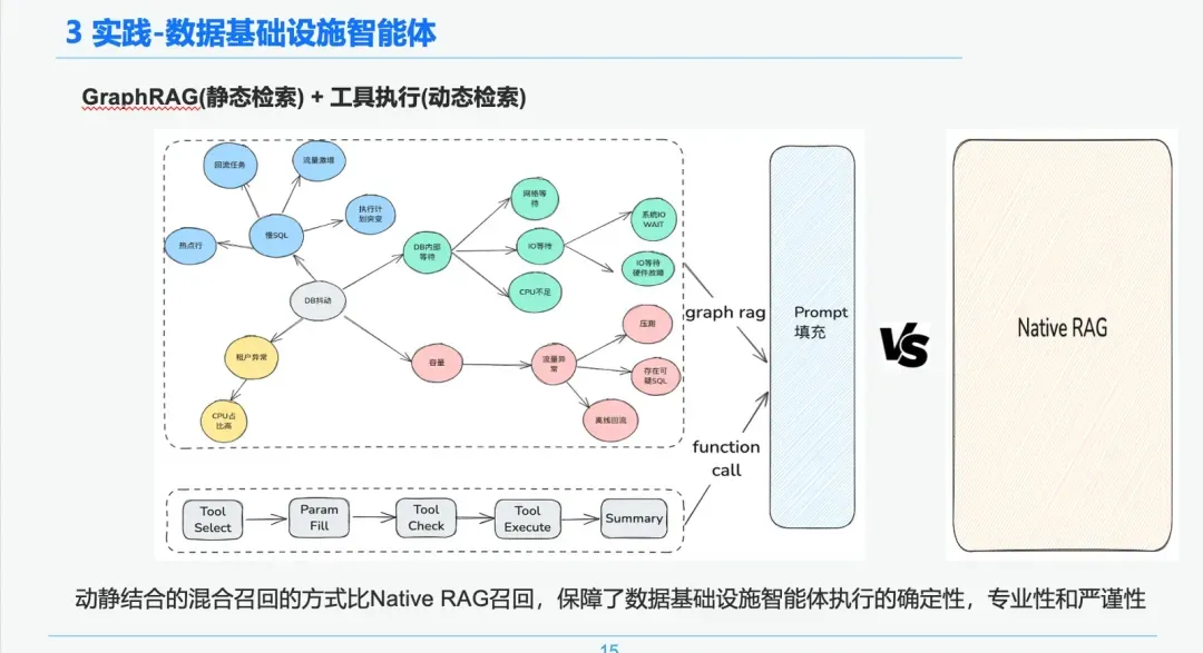 因此我们可以通过执行工具的执行生命周期链路来获取返回结果拿到动态数据来作为应急诊断的排查依据。通过这种动静结合的混合召回的方式比纯朴素的RAG召回,保障了数据基础设施智能体执行的确定性,专业性和严谨性。
