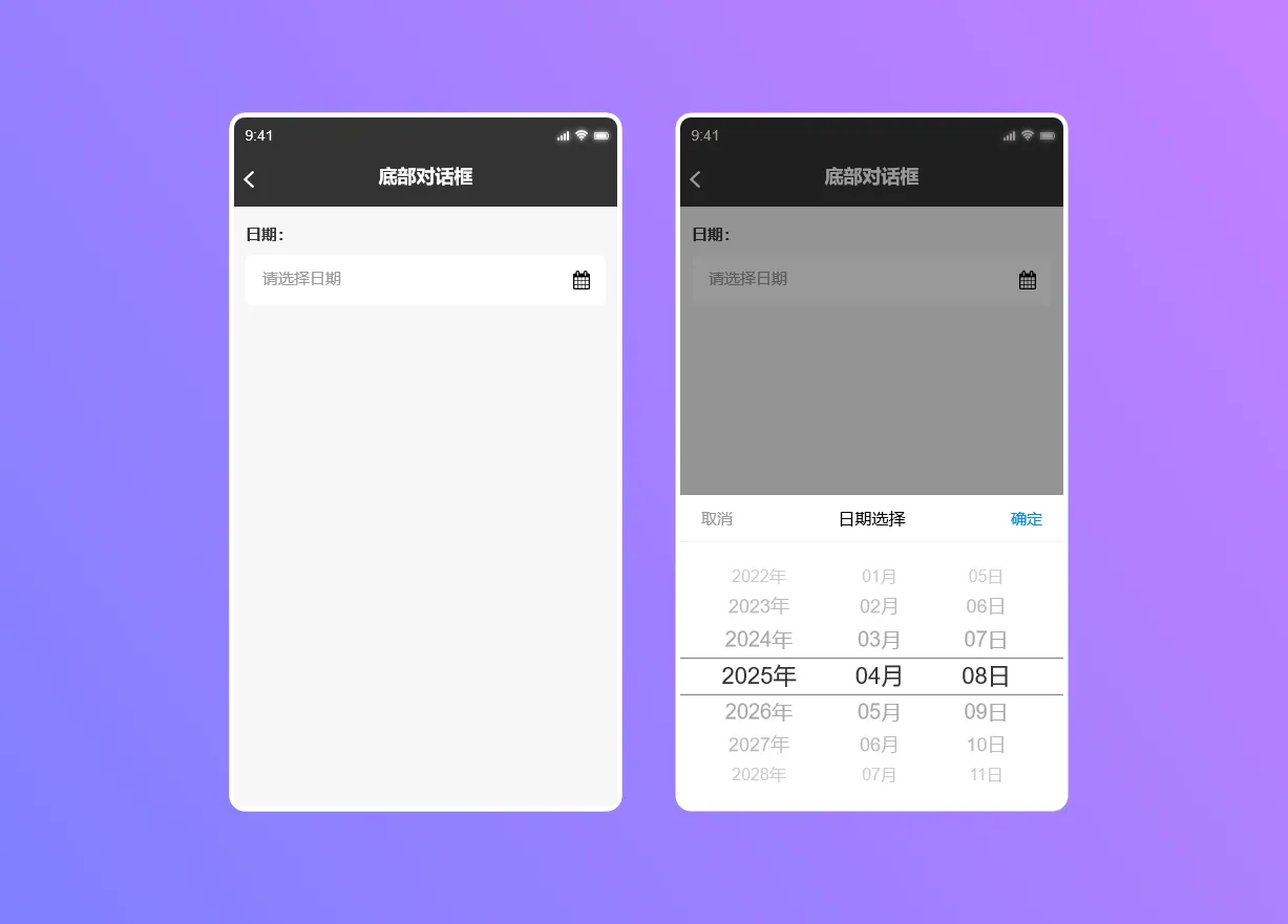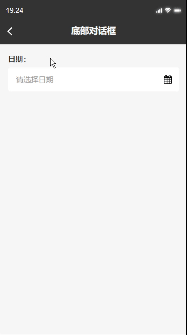 下面给大家演示一下案例效果,点击日期文本框模拟真实手机效果,日期选择器对话框从底部向上滑动显示,并且对页面内容进行遮罩,防止触发其他事件,可以取消和确认选择日期进行操作,确认后在日期文本框显示选择的日期。下面是效果演示: