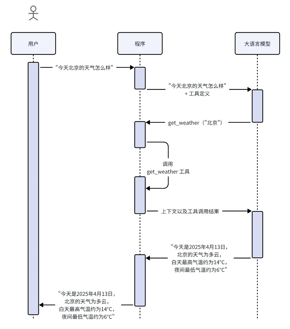 大语言模型本身不具备调用工具的能力,但通过在训练阶段的设计和微调,可以让模型学会判断在什么情况下需要调用工具,生成结构化的数据(如函数名和参数),然后告诉外部程序需要调用哪些函数。