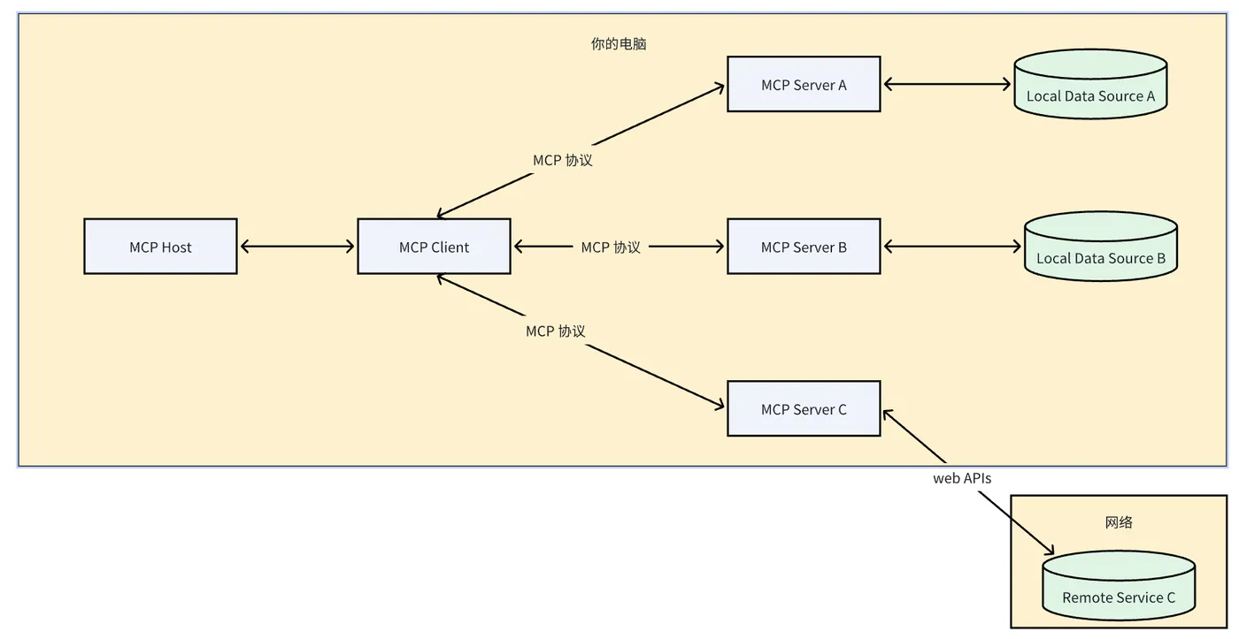 - Local Data Sources:MCP 服务器可安全访问的本地计算资源,包括文件系统、数据库和本地服务
