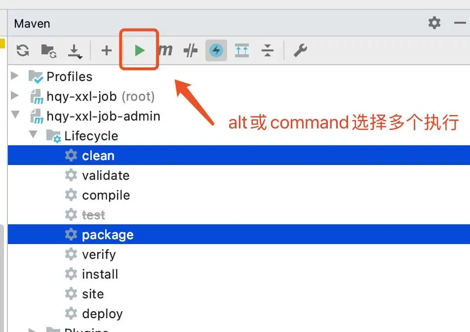 在执行打包构建时如果不需要执行单元测试,可选择闪电符号。