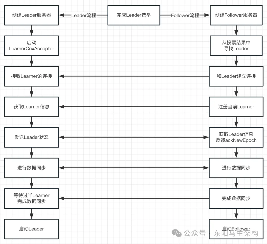 由于QuorumPeer线程会不断检测当前服务器的状态并做相应处理,所以当QuorumPeer线程 + FastLeaderElection守护线程完成Leader选举后,每个zk服务器都会根据节点状态创建相应的角色实例来完成数据同步。