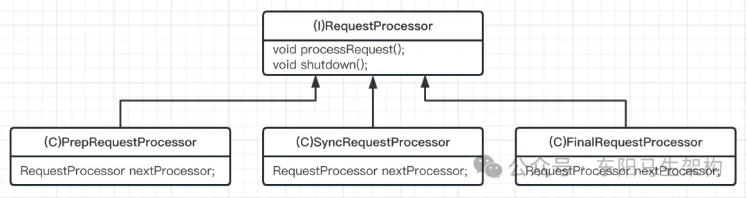 zk处理请求的方式是典型的责任链模式,zk服务端会使用多个请求处理器来依次处理一个客户端请求。所以在服务端启动时,会将这些请求处理器串联起来形成一个请求处理链。