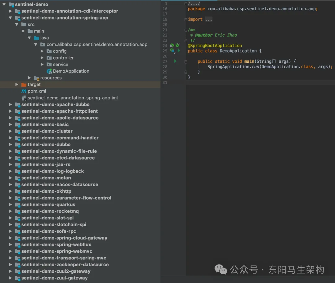 Sentinel已为我们提供了sentinel-demo模块,其中包含了各种Demo。例如和Dubbo整合的、和okhttp整合的、和Gateway整合的等等。而且前面已经编译好了此模块,因此可以直接启动这些Demo应用。