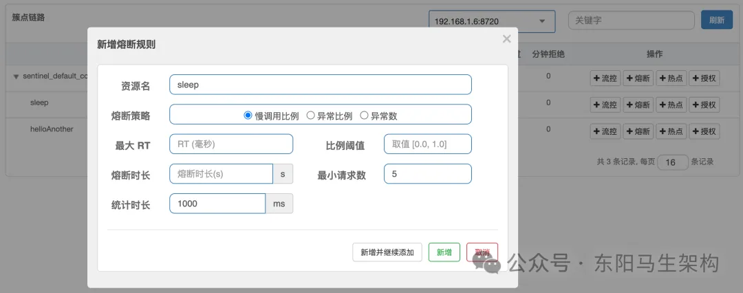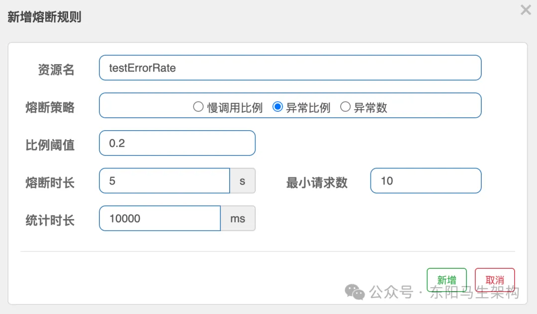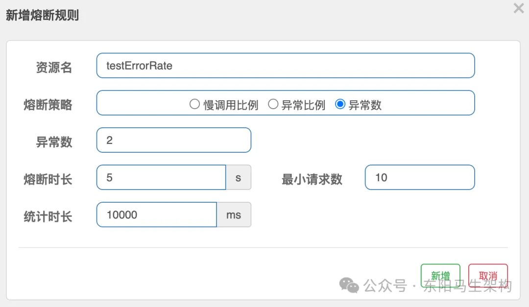 异常数就是在单位时间内超出错误数则触发熔断,和异常比例唯一不同的就是异常比例是计算百分比,而异常数是直接计算错误数量。