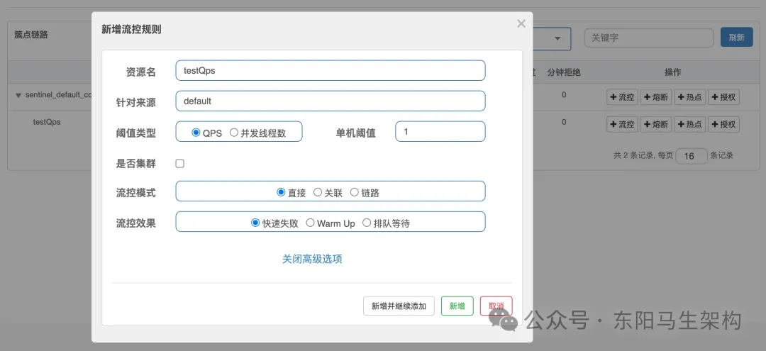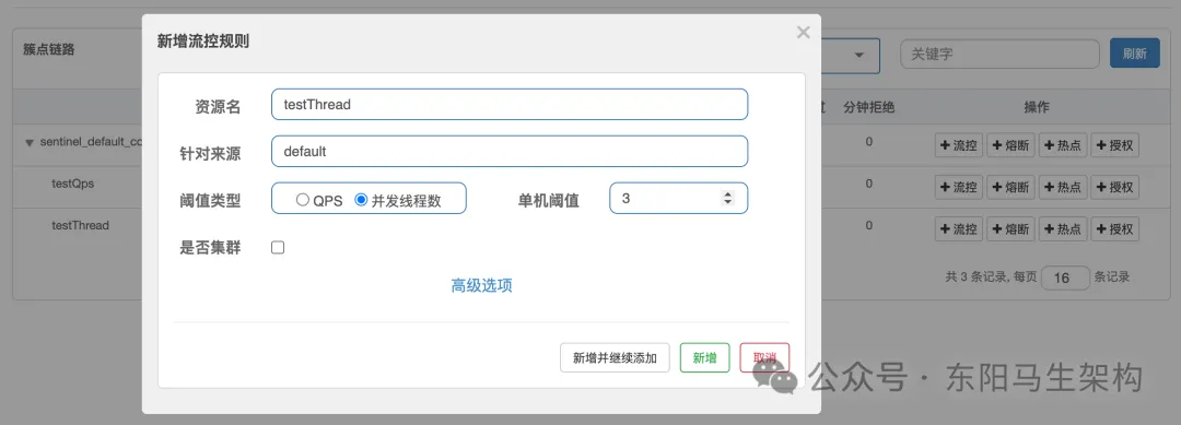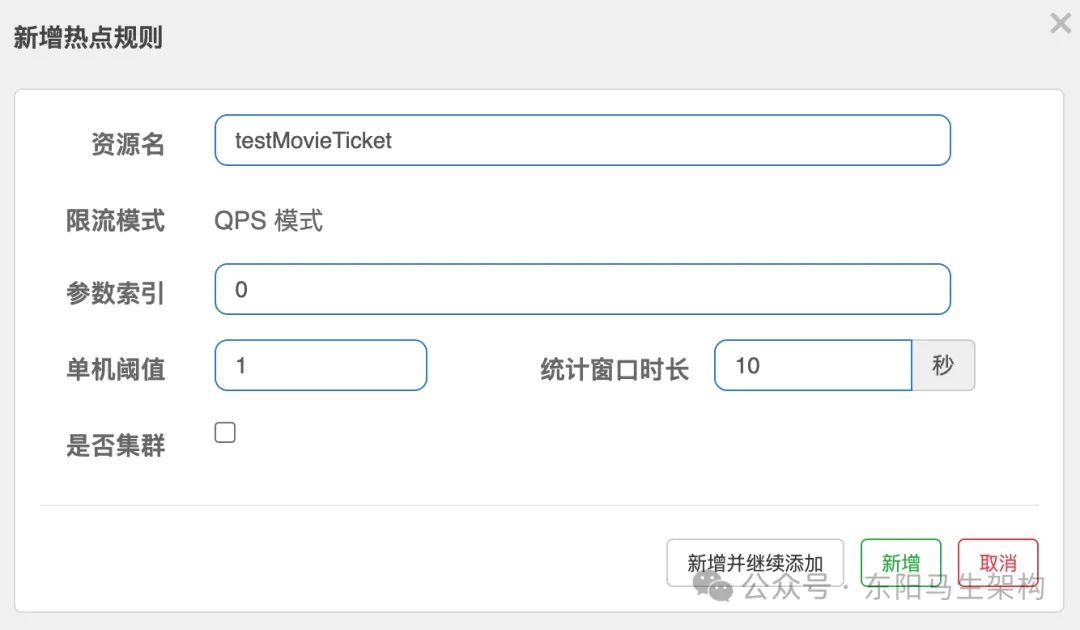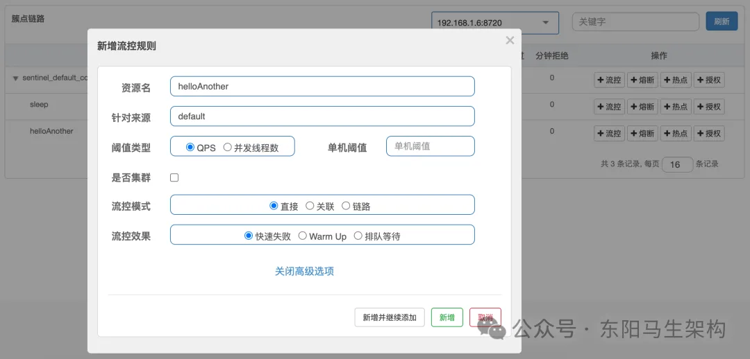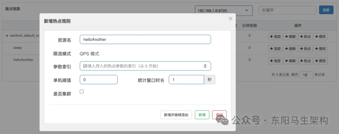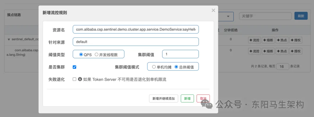 接着,新建一个集群规则:集群QPS阈值为1。这也就意味着三台服务加起来的QPS为1,即整个集群内1s只能访问一次。配置如下图所示: