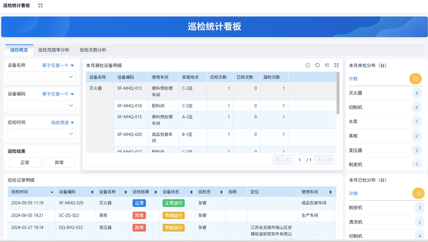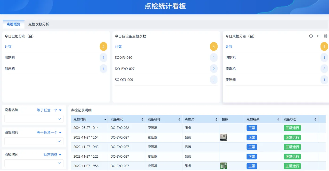 功能介绍:点检统计看板主要展示设备的点检情况,包括点检频率、点检完成情况、点检异常记录等。