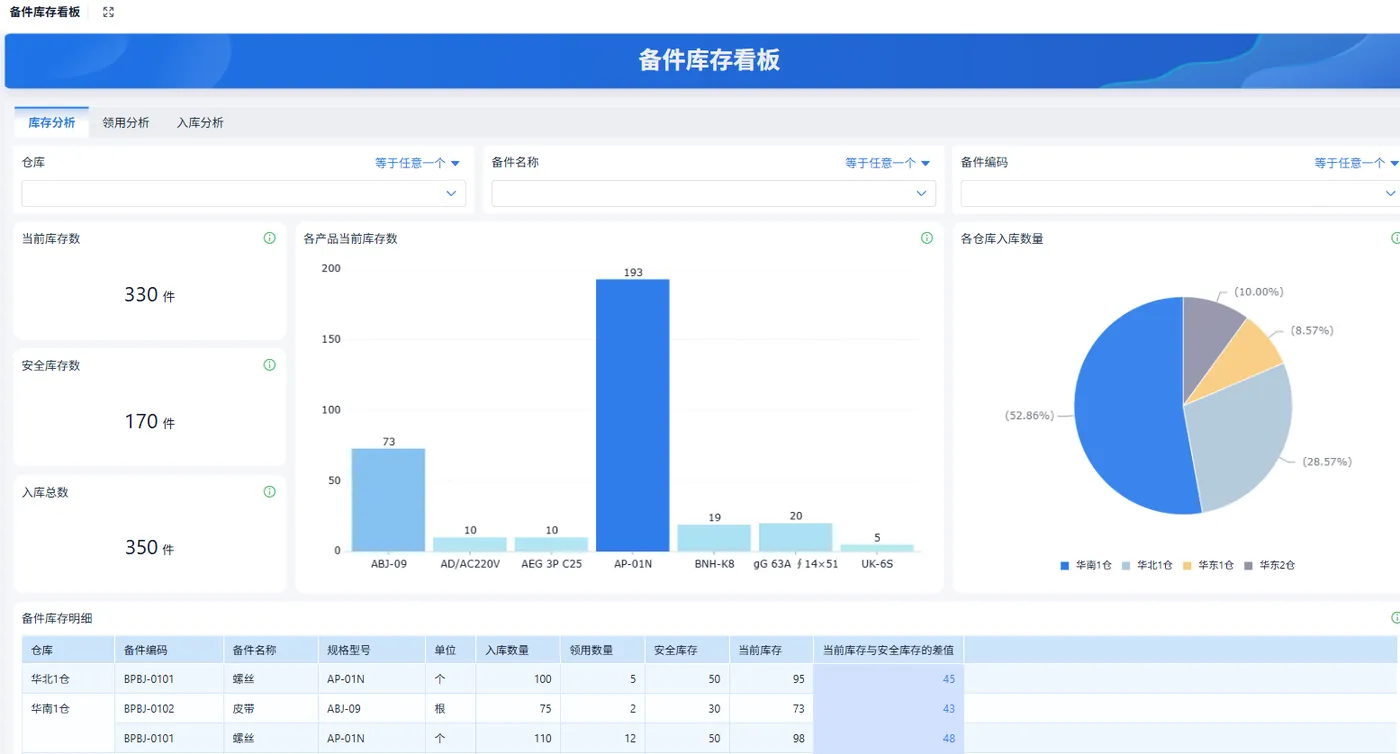 功能介绍:备件库存看板用于显示各类备件的库存状况,帮助管理者及时发现库存不足、超期库存等问题。
