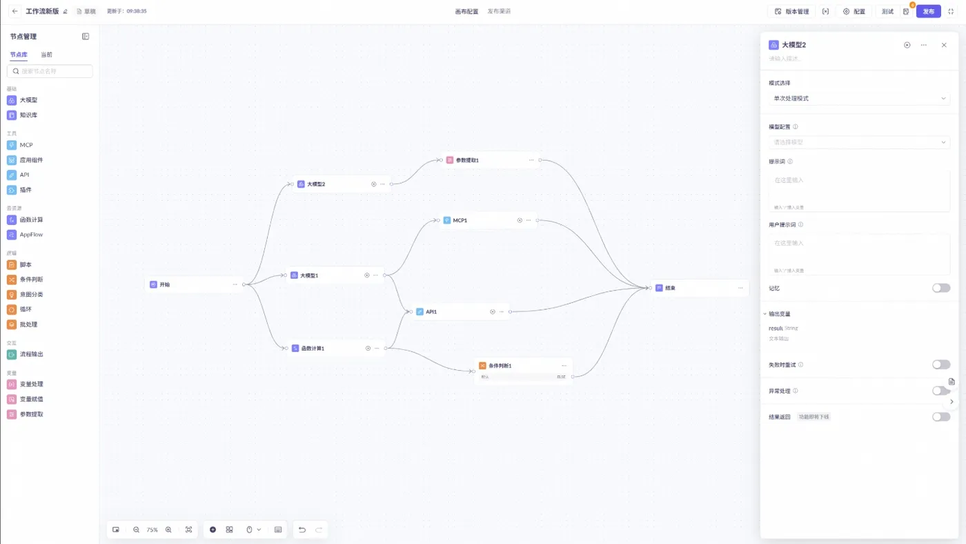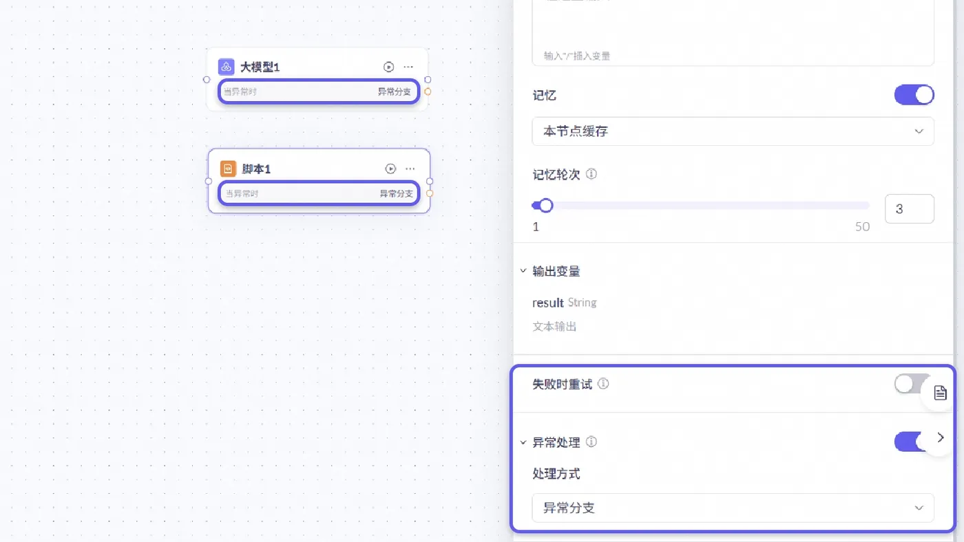对可能失败的节点(脚本节点和大模型节点)增加失败重试和异常分支处理功能,提升流程稳定性与容错能力。