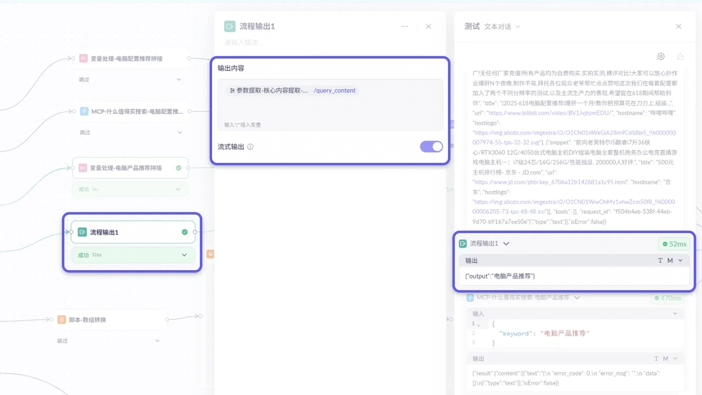 引入“流程输入”和“流程输出”节点,支持在测试过程中模拟用户输入和中间输出,便于实现交互式场景(如对话式流程)。