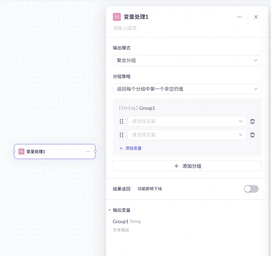 在变量处理节点中新增“聚合分组”逻辑,支持按规则(如返回第一个或最后一个非空值)合并多个分支的输出结果,适用于多分支流程筛选输出内容。