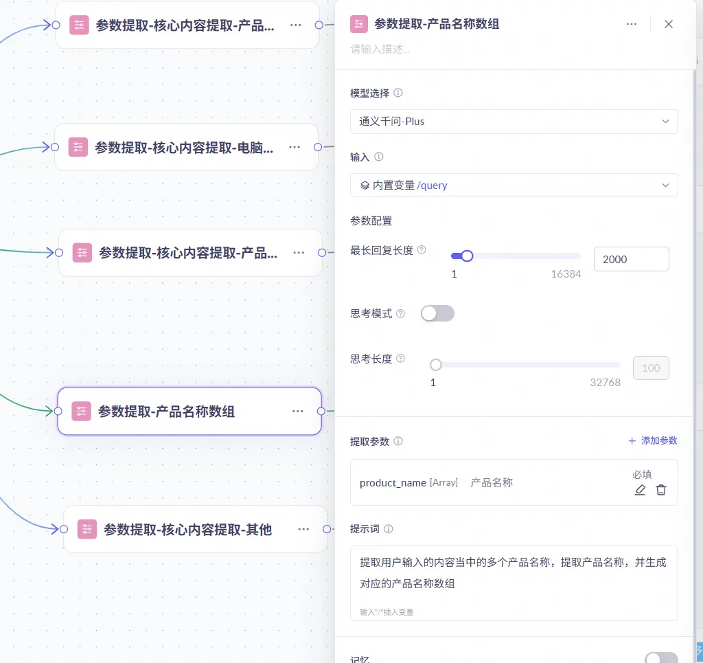 新增基于大模型的参数提取节点,用于从用户输入中提取结构化字段(如产品名称),便于后续流程引用。
